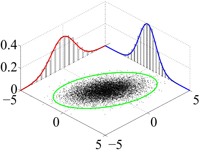 Here is another view of a similar multivariate normal distribution, now showing the individual normal distributions plus the joint distribution as a “dot map.” They both depict the same information.