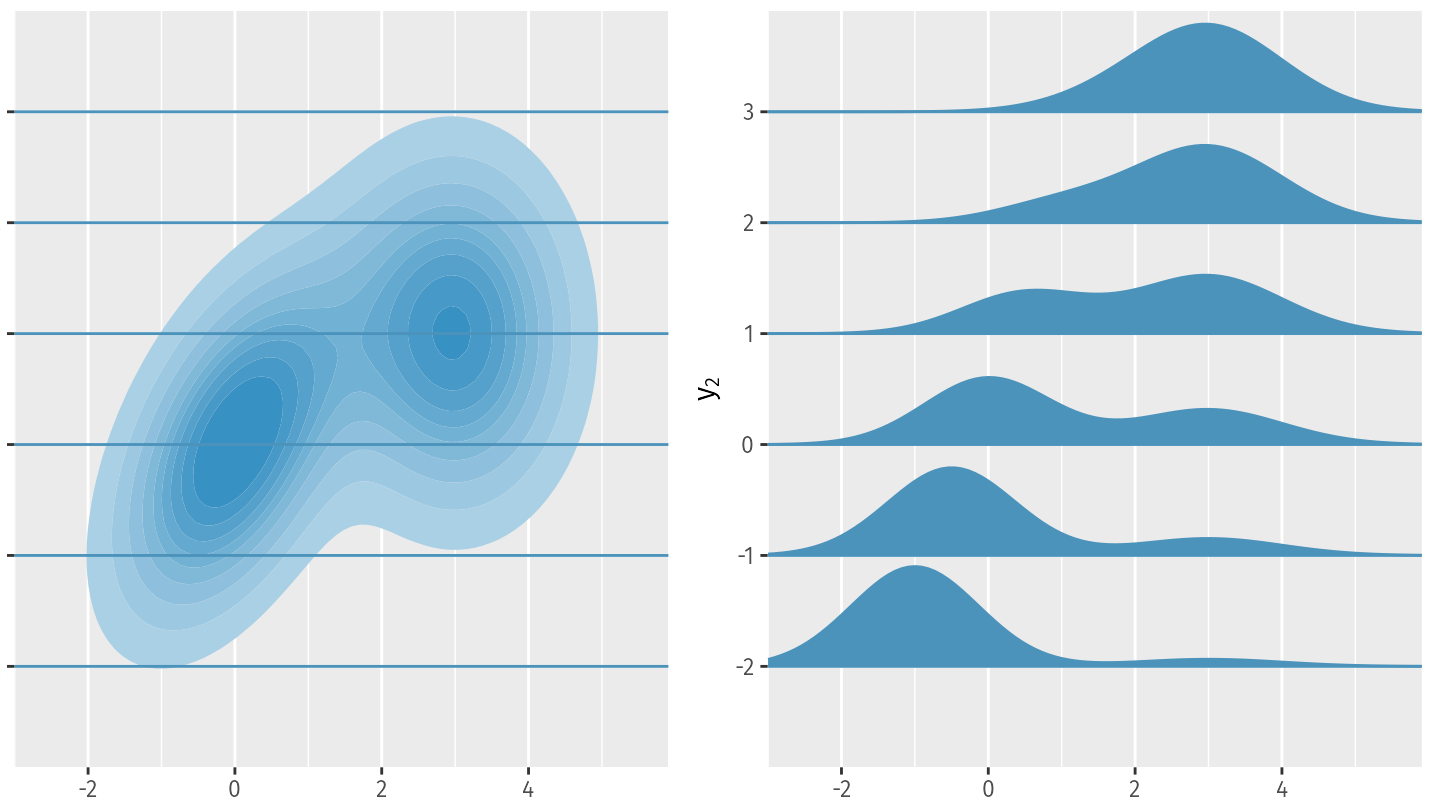 Essentially, the probability at any point (xi, yj) is equal to the “slice” P(Y | X = xi) evaluated at yj times p(xi). This can be understood as a two-dimensional probability “lookup”.